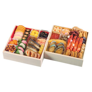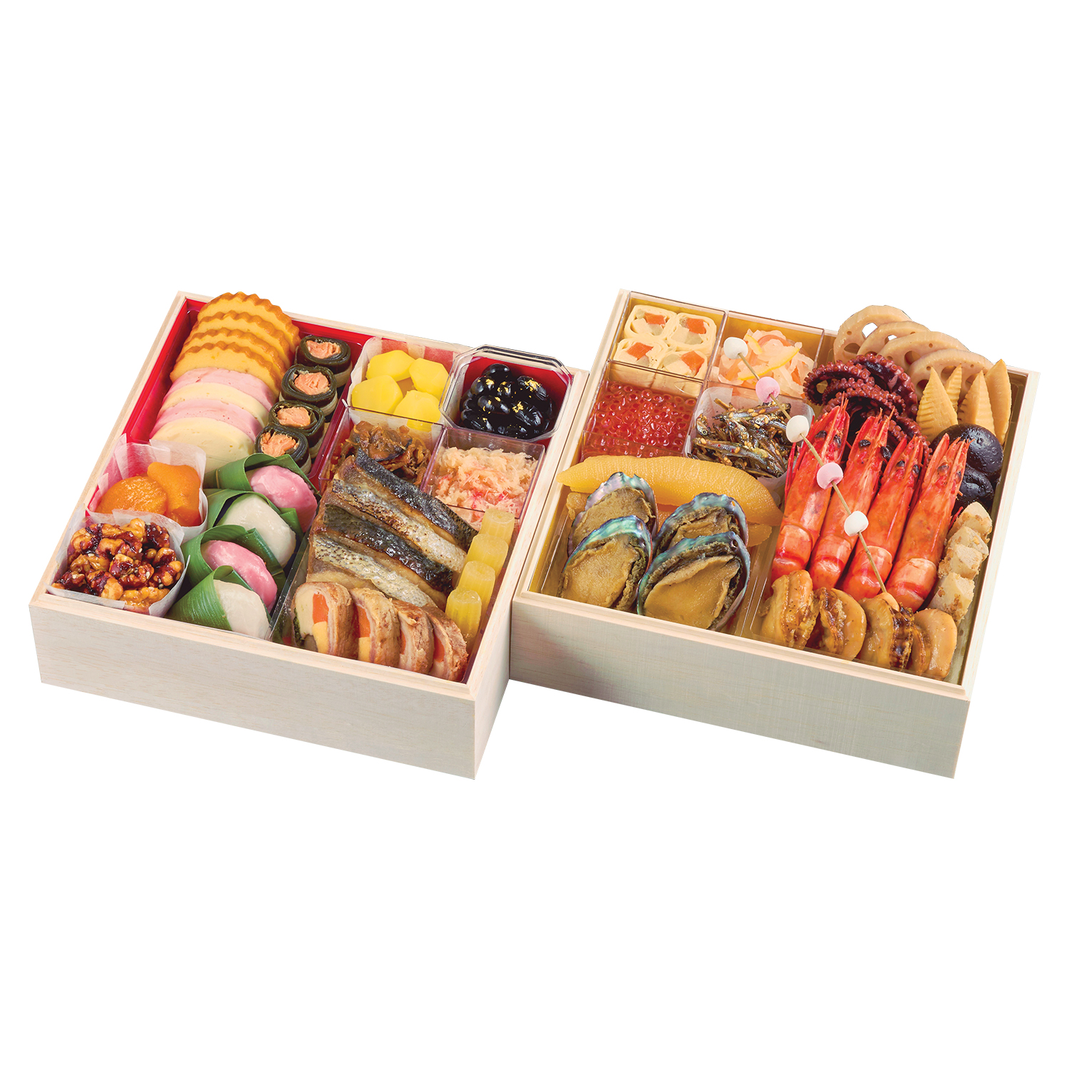 湯葉と豆腐懐石の名店。縁起の品に加え、高野豆腐と野菜の湯葉巻や麩まんじゅうなど、自慢の美味も取り揃えました。<1段目>高野豆腐と野菜の湯葉巻き、紅白なます、北海道産いくら醤油漬け、田作り、数の子、煮あわび、蓮根煮物、筍煮物、煮蛸、椎茸煮物、煮海老、たたき牛蒡、帆立山椒焼き、餅花飾り<2段目>柚子入り伊達巻き、湯葉入り紅白かまぼこ、鮭昆布巻き、紅白笹麩まんじゅう、あんぽ柿、くるみの飴炊き、栗きんとん、黒豆、牡蠣と湯葉の佃煮、蟹と湯葉の蟹味噌和え、鰤柚庵焼き、蕗煮物、牛すき巻き