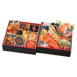 市松蒲鉾、椎茸煮、叩き牛蒡、花こんにゃく、昆布巻、焼筍煮、甲羅盛り(かに味噌和え)、北寄貝と青菜の柚子胡椒和え、田作り、紅白なます、いくら醤油漬、いか梅酢、こはだ粟漬、伊達巻、海老艶煮、赤魚味醂焼、なごみ巻(海老)、なごみ巻(ほうれん草)、たら煮、若桃甘露煮、松竹梅松葉