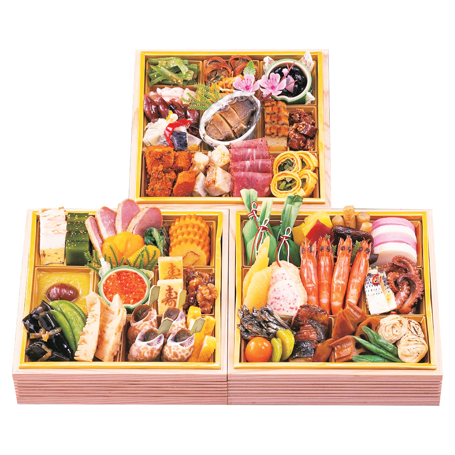 紅ズワイガニの紅白テリーヌ、抹茶金箔ようかん、合鴨オレンジソース煮、杏子白ワイン煮、菜の花醤油漬け、伊達巻、芋きんとん、渋皮栗甘露煮、大根と人参のなます、いくら醤油漬け、寿玉子、くるみと小女子の飴煮、にしん昆布巻、穂先筍土佐煮、エンドウ醤油漬け、バイ貝醤油煮、いか鹿の子焼き