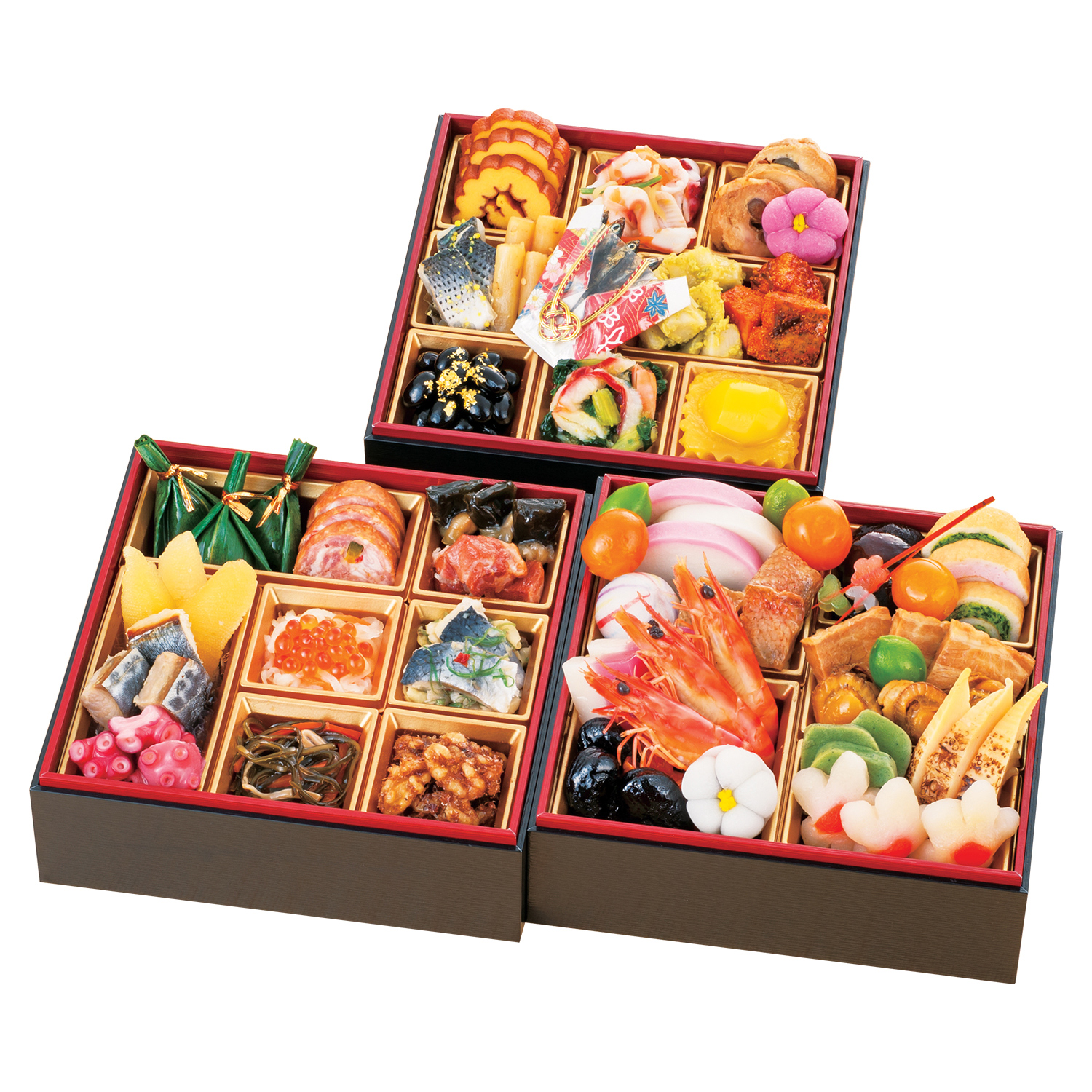 紅白蒲鉾、赤魚味醂焼、金柑蜜煮、若桃甘露煮、手まりもち、椎茸煮、なごみ巻(ほうれん草)、なごみ巻(海老)、白梅もち、いちごミルク羊羹、お多福豆、海老艶煮、貝照焼、豚角煮、松竹梅松葉、味付よもぎ麩、焼筍煮、花こんにゃく