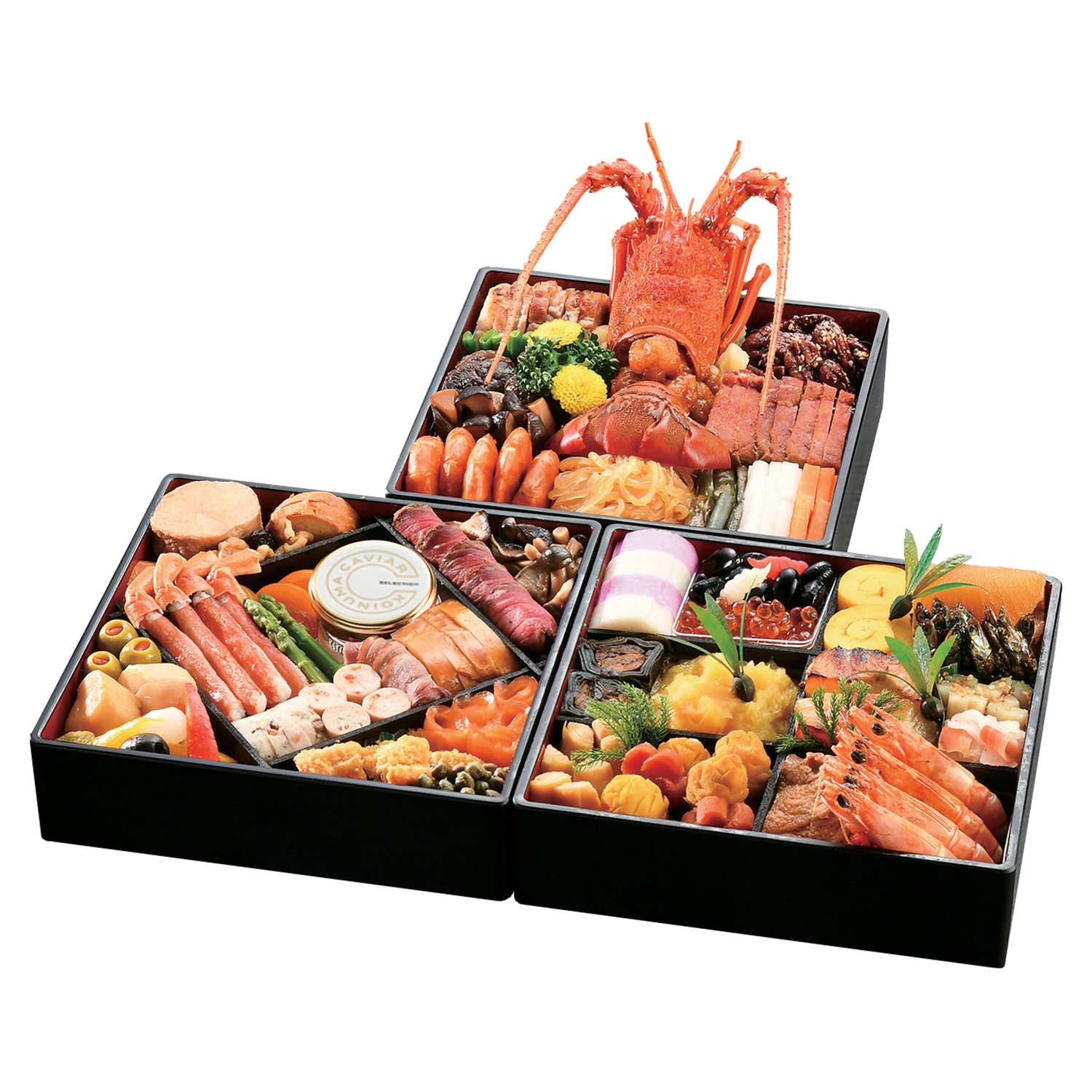紅白小袖蒲鉾、鰊昆布巻き、新筍含め煮、黒豆蜜煮、塩いくら、栗きんとん、人参梅花仕立て、松笠慈姑、柚子伊達巻、数の子醤油漬け、田作り、銀鱈西京焼、叩き牛蒡、紅白なます、鶏旨煮、車海老酒煮