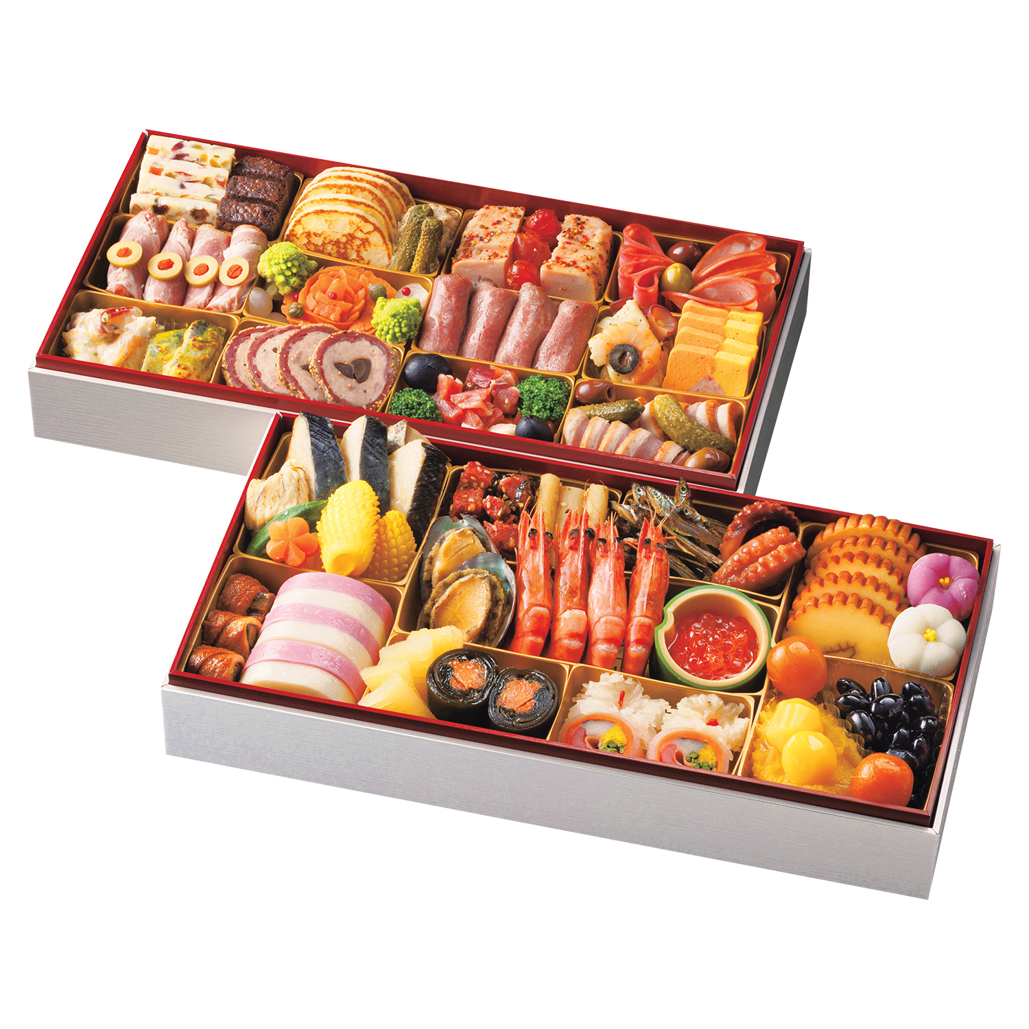 鰆西京焼、一口焼湯葉、イカサフラン、梅人参煮、割烹おくら、まぐろ昆布、たたきごぼう、田作り、蛸煮、伊達巻、紅白花餅、鮑姿煮、有頭海老の艶煮、いくら醤油漬け、穴子八幡巻、紅白蒲鉾、数の子、紅鮭昆布巻、菊花大根、華きぬた、黒豆、栗金団、金柑甘露煮
