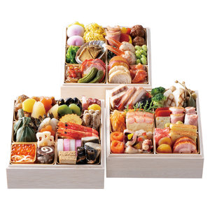 鱈煮、味付数の子、金箔黒豆煮、あしらいそら豆、蛸梅酢和え、笹茶巾餅、田作り煮、烏賊松笠白焼、柚子伊達巻、牛蒡胡麻和え、海老旨煮、味付イクラ、なます、柿鳴門、花酢れんこん、紅白蒲鉾、鰆西京焼、鶏松風、ひと口にしん昆布巻、栗甘露煮、花こんにゃく煮