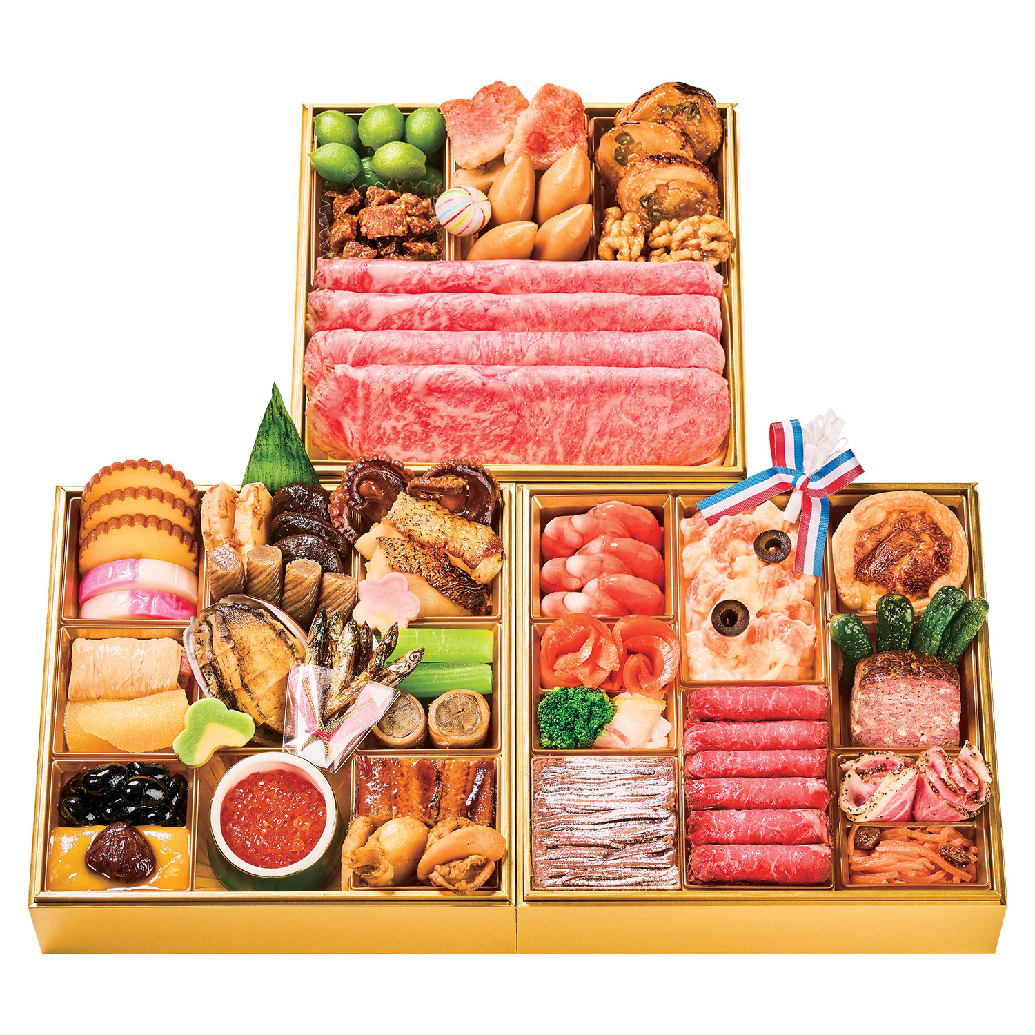 紅白かまぼこ、伊達巻、穴子八幡巻、ふき、黒豆、栗きんとん、筍土佐煮、こんにゃく、煮〆椎茸、鮑、麩、田作り、いくら醤油漬、タコの柔らか煮、カレイ西京焼き、湯葉野菜巻、焼帆立、鰻のテリーヌ、味付数の子