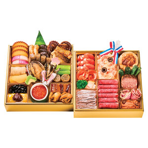 紅白かまぼこ、伊達巻、穴子八幡巻、ふき、黒豆、栗きんとん、筍土佐煮、こんにゃく、煮〆椎茸、鮑、麩、田作り、いくら醤油漬、タコの柔らか煮、カレイ西京焼き、湯葉野菜巻、焼帆立、鰻のテリーヌ、味付数の子