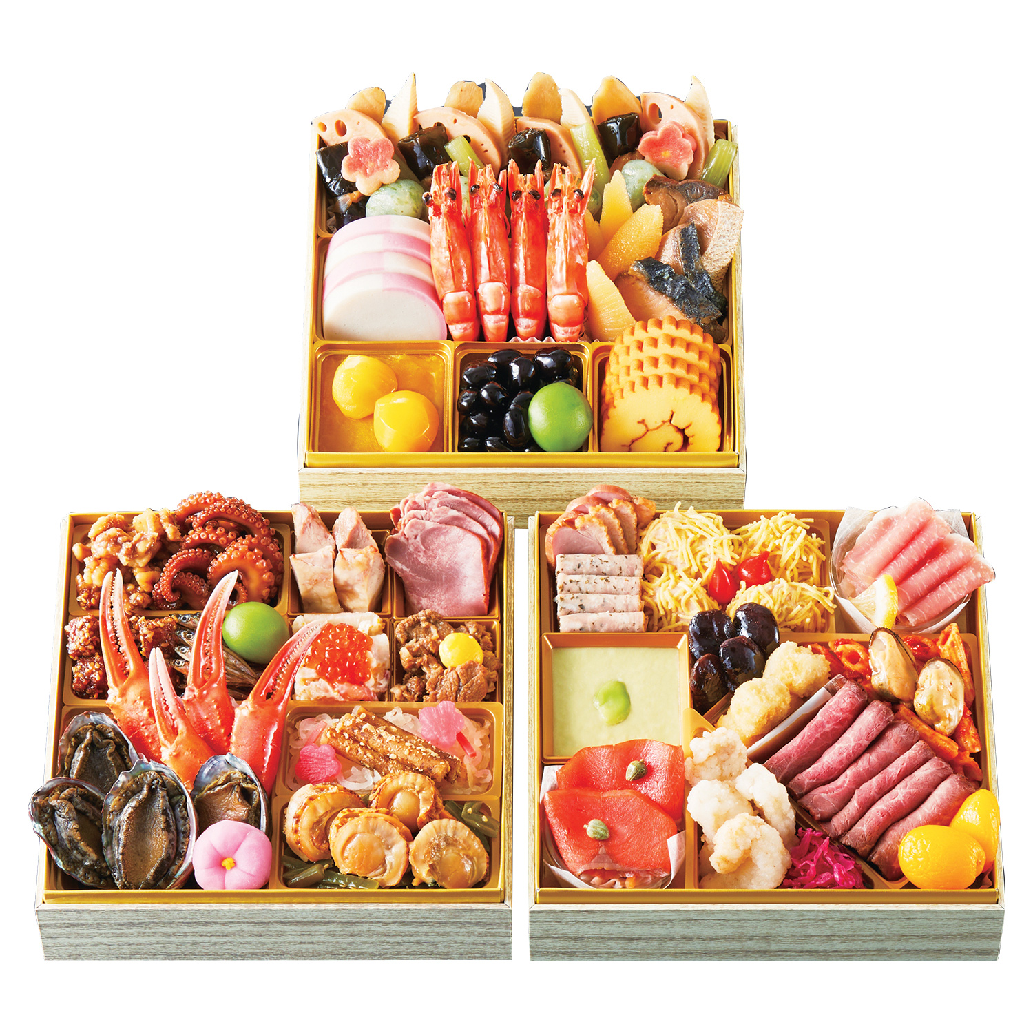 くるみ甘露煮、たこ照焼、鶏の塩麹焼、岩塩仕込み豚タンスモーク、金ごままぐろ角煮、田作り、イカとカナダホッキ貝のサラダ、いくら醤油漬、牛カルビ炭火焼、銀杏、かに爪柚庵焼、えぞあわび姿煮、花餅(紅梅)、紅白なます、叩きごぼう、花型大根、茎わかめの塩ナムル、帆立照焼