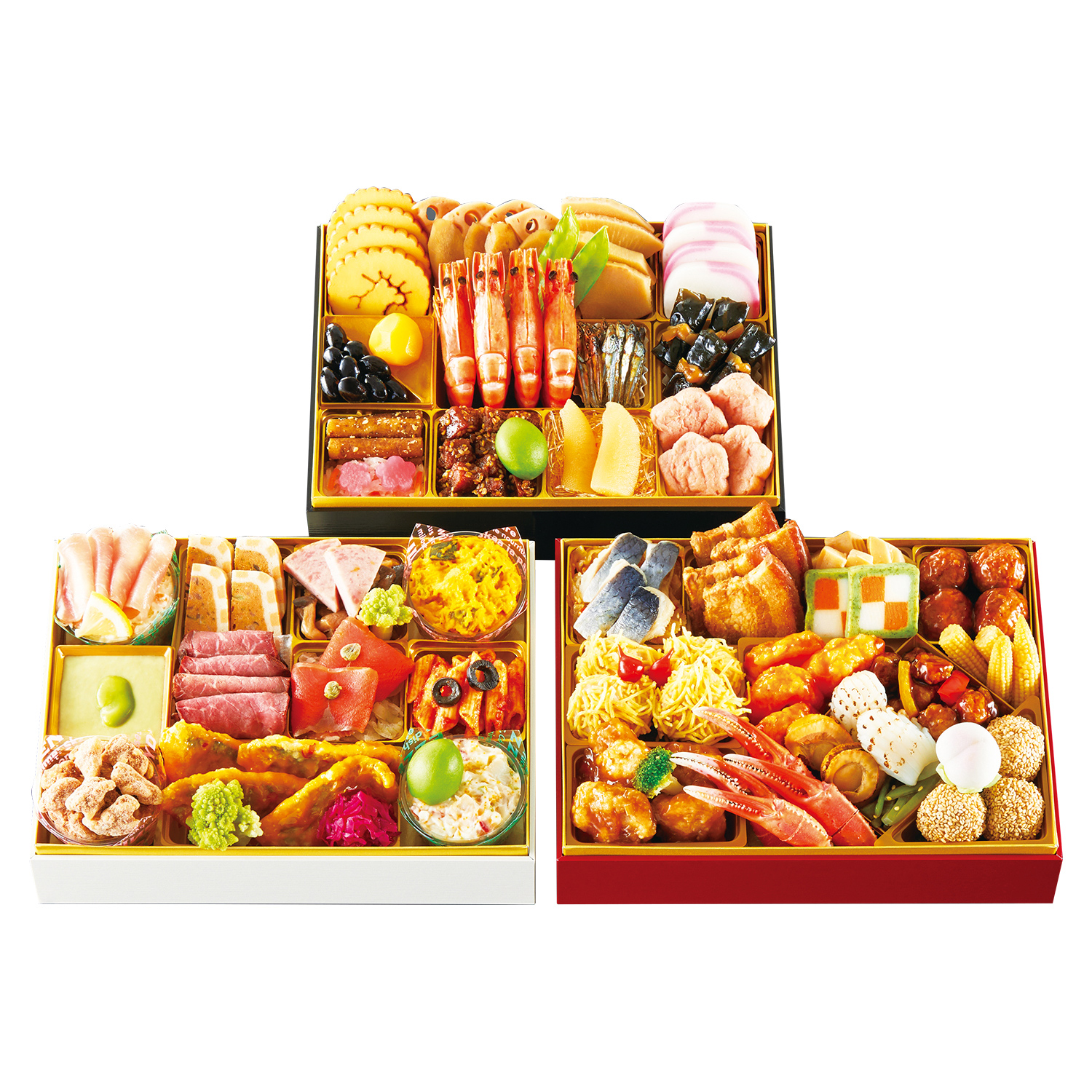 伊達巻、煮〆れんこん、竹の子含め煮、煮〆ごぼう、浅漬きぬさや、紅白かまぼこ、丹波黒ぶどう豆、栗きんとん、祝えび、田作り、叩きごぼう、紅白なます、花型大根、金ごままぐろ角煮、若桃甘露煮、フカヒレ風魚卵和え、味付数の子、一口にしん昆布巻、花がんも煮