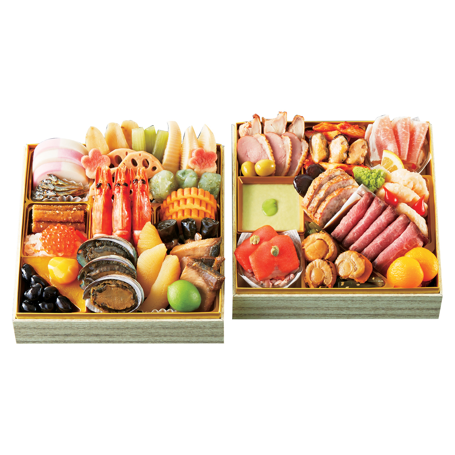 紅白かまぼこ、田作り、煮〆ごぼう、煮〆れんこん、ふき含め煮、竹の子含め煮、あおさこんにゃく煮、花麩煮、叩きごぼう、紅白なます、いくら醤油漬、祝えび、伊達巻、一口にしん昆布巻、栗きんとん、丹波黒ぶどう豆、えぞあわび姿煮、味付数の子、ぶり照焼、若桃甘露煮