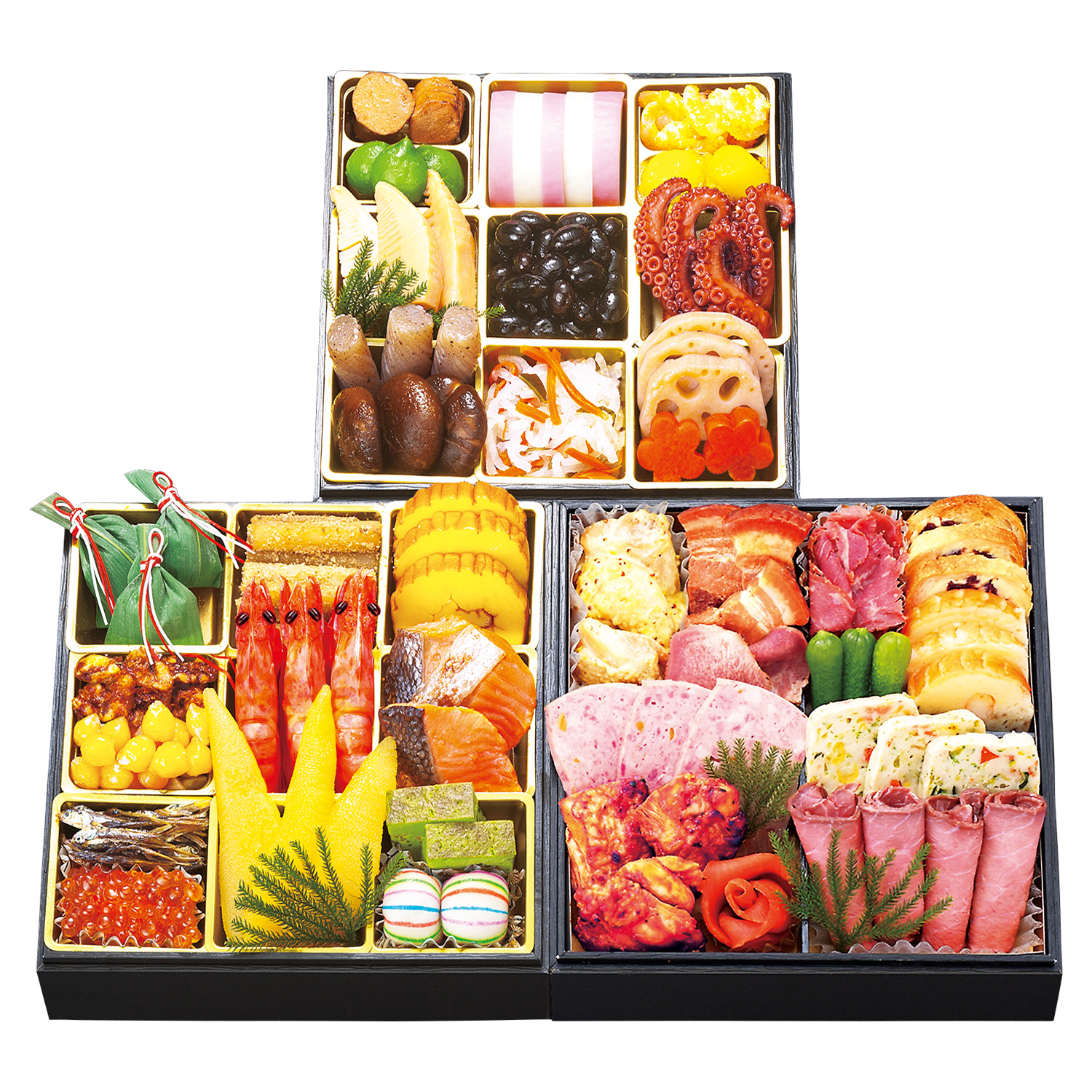 魚卵の旨煮、若桃の甘露煮、紅かまぼこ、白かまぼこ、小海老の魚卵和え、栗の甘露煮、きんとん、筍焚、丹波黒豆、蛸旨煮、綱糸こんにゃく焚、しいたけ焚、紅白生酢、れんこん焚、金時人参焚