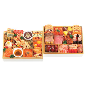 レーズンバターパン、カシューナッツの飴だき、鶏のトマトソース、栗きんとん・金箔飾り、ウッドロール、ドライアプリコット、豚肉と豚タンのテリーヌ、焼豚、スタッフドオリーブ、ローストビーフ、ビーンズデミグラスソース煮、角切りローストビーフ・デミグラスソース、オニオンデミグラスソース煮、ボイルブロッコリー、合鴨パストラミ・バルサミコソース、きのこソテー、ライプオリーブ、デミグラスソースハンバーグ、生ハムサラダ、ホワイトパストラミ、ドライトマトの赤ワイン煮、砂肝ガーリックオイル