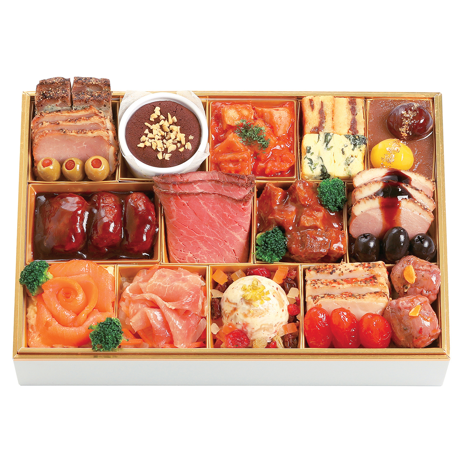 豚肉と豚タンのテリーヌ、焼豚、スタッフドオリーブ、ショコラ、鶏のトマトソース、ゴルゴンゾーラとレーズンのバストンチーニ、野菜のキッシュ、栗きんとん・金箔飾り、デミグラスソースハンバーグ、ローストビーフ、ビーンズデミグラスソース煮、角切りローストビーフ・デミグラスソース、オニオンデミグラスソース煮、合鴨パストラミ・バルサミコソース、きのこソテー、ライプオリーブ、スモークサーモントラウトローズ、チェダーシュリンプサラダ、生ハムサラダ、貝のサラダ仕立て・ドライフルーツ添え、ホワイトパストラミ、ドライトマトの赤ワイン煮、砂肝ガーリックオイル、ボイルブロッコリー