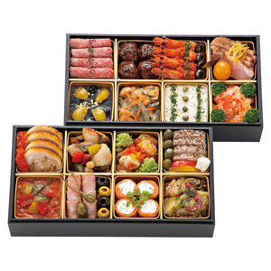 和牛ローストビーフ ビーンズデミグラスソース煮添え、和牛のポルペッティー 赤ワインソース、海老のトマトソース風味、合鴨オレンジ風味 金柑添え、黒豆と栗のブランデージュレ、銀鮭のエスカベッシュ、ローストポーク トンナートソース、オマール海老とイカのオーロラソース和え