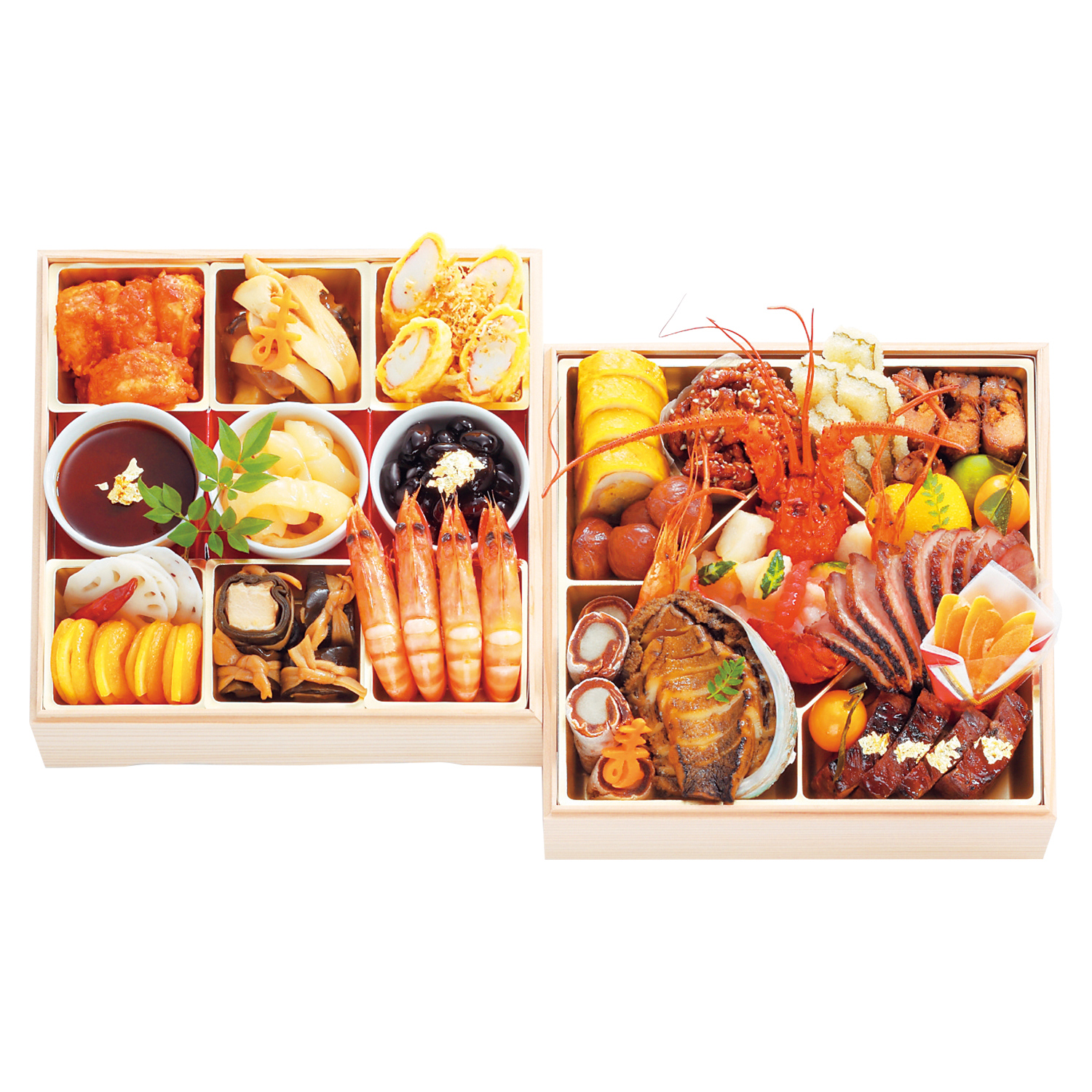 名古屋コーチンのごぼう巻き、栗の渋皮煮、くるみの北京風蜜煮、子持ち昆布の紹興酒風味、子持ち鮎の山椒香り煮、編み傘柚子の蜜煮、若桃の甘露煮、伊勢海老と帆立貝の炒め物、干し柿の白餡巻き、殻付き活け鮑の紹興酒煮、黒毛和牛の蜜漬け香り焼き、合鴨のフィレの香り焼き、炙り唐墨、金柑の蜜煮、川海老のうま煮、千代呂木の甘酢漬け、寿にんじんの甘露煮