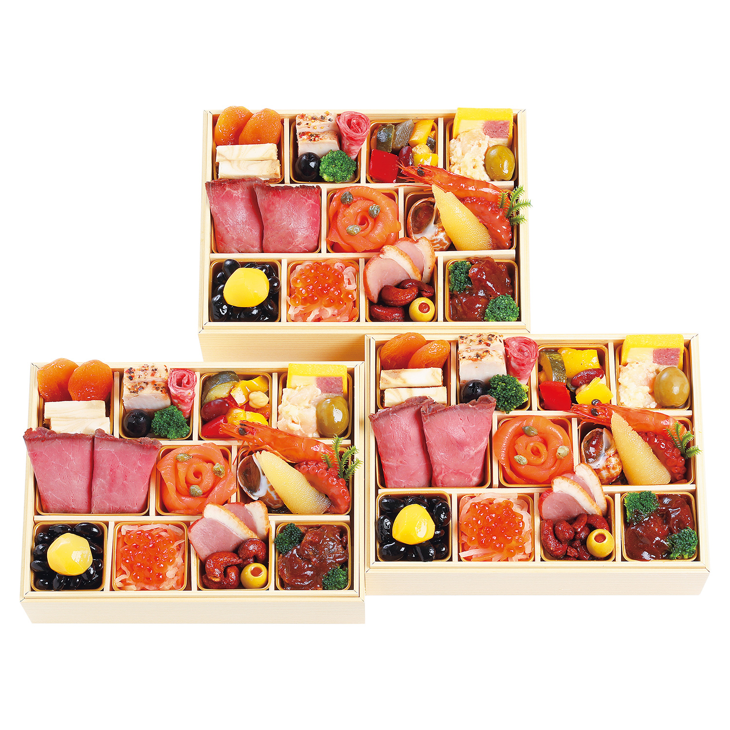 ドライアプリコット、黒糖ブランマンジェ、ホワイトパストラミ、ボロニアソーセージ、ライプオリーブ、彩り野菜のバーニャカウダマリネ、市松チーズ<南瓜ムース包み>、チェダーシュリンプサラダ、グリーンオリーブ、ローストビーフ、ビーンズデミグラスソース煮、スモークサーモントラウトローズ・ケッパー添え、バイ貝煮、味付数の子、松前漬け、海老旨煮、たこ小倉煮、黒豆煮、栗甘露煮、味付いくら、なます、合鴨スモーク、カシューナッツの飴だき、スタッフドオリーブ、ビーフシチュー、ボイルブロッコリー