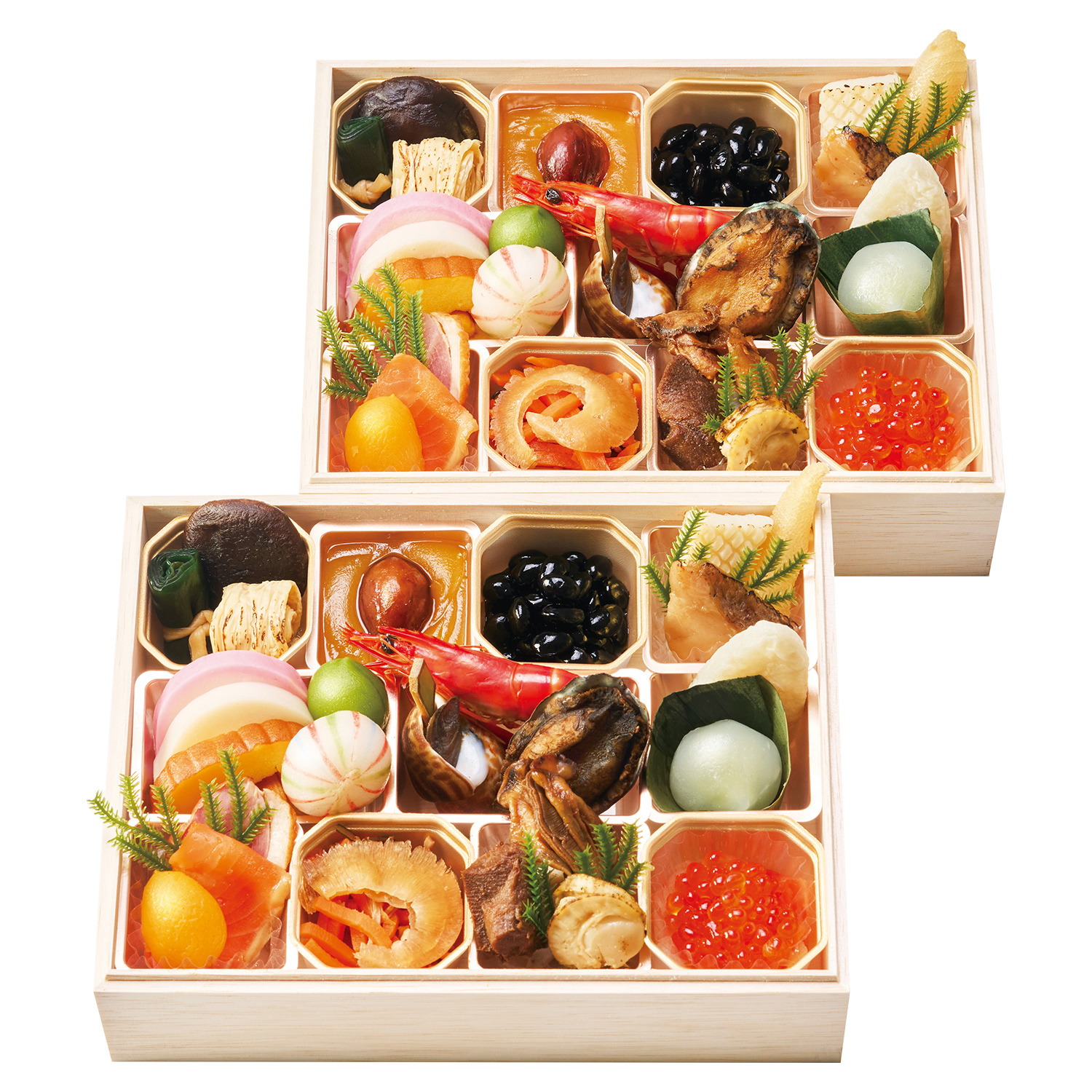 東北の老舗が手がけたおせち。フカヒレやほたてなど海の幸を贅沢に使いました。<1段目>椎茸煮、昆布巻、焼湯葉煮、きんとん、渋皮栗甘露煮、黒豆煮、味付数の子、真鯛幽庵焼、いか白焼、紅蒲鉾、白蒲鉾、伊達巻、若桃甘露煮、手まり餅、海老の旨煮、バイ貝甘煮、あわび煮、笹蒲鉾、笹巻ずんだ葛餅、合鴨スモーク、スモークサーモントラウト、杏子煮、いか人参、味付フカヒレ、牛たん角煮、牡蠣佃煮、帆立香草焼、紅白なます、味付いくら<2段目>1段目と同内容