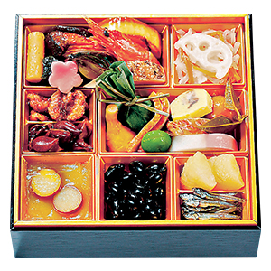 <内容>鰹くるみ、田作り、黒豆、きんとん、五郎島金時芋蜜煮、ホタルイカピリ辛、数の子、紅白市松かまぼこ、若鳥八幡巻、葉付き金柑、卯巻、若桃シロップ、味付くわい松笠、紅茶鴨スモーク、笹巻団子、伊達巻、蝦夷あわび、しいたけ旨煮、焼きたけのこ、佃煮昆布、たたきごぼう、海老旨煮、ブリ照焼き、紅白なます、加賀蓮根酢漬け、加賀梅麩