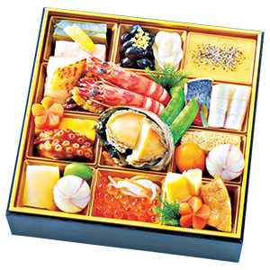<内容>かじき昆布〆、百合根入り蟹真丈、網笠柚子、黒豆ブランデー風味、花百合根蜜煮、五郎島金時のきんとん黒胡椒風味、銀鱈西京焼、小女子くるみ、車海老旨煮、鰊マリネ、小鯛酢〆、カステラ玉子、蛸柔らか煮、梅人参煮、あわび旨煮、松前漬、味付絹さや、フォアグラ入りレーズン松風、金柑蜜煮、手まり餅、味付数の子、若桃蜜煮、柚子入り紅白なます、いくら醤油漬、筍土佐煮、真鱈甘露煮