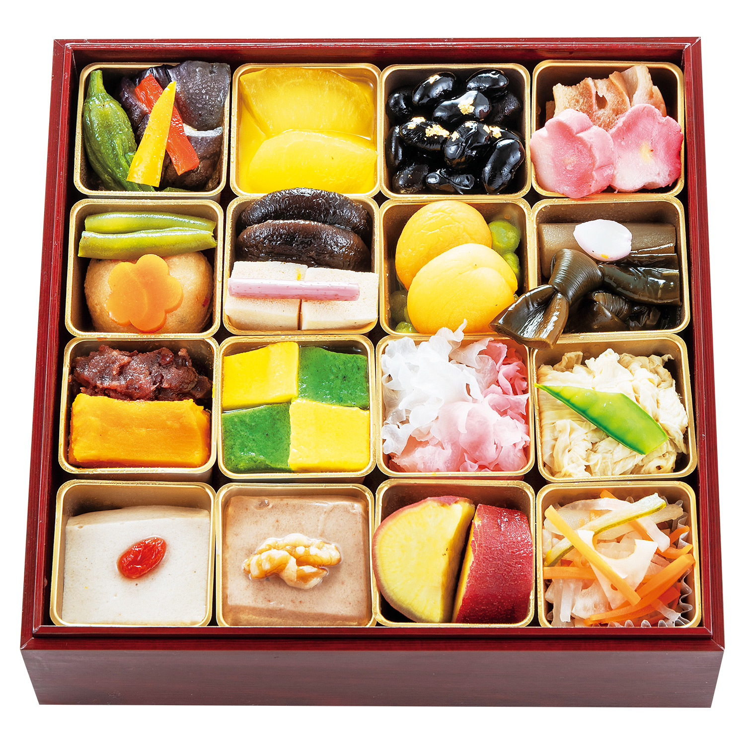 <内容>揚げ茄子、青しし唐、赤黄パプリカスライス、林檎きんとん、黒豆金箔、車麩、梅型麩、いんげん、がんも煮、梅型人参、椎茸旨煮、いんげん、がんも煮、杏子煮、うぐいす豆、むすび昆布、牛蒡田舎煮、はなびらゆり根、かぼちゃのいとこ煮、蓬麩、粟麩、紅白きくらげ煮、湯葉含め煮、胡麻豆腐クコの実のせ、胡桃豆腐胡桃のせ、さつまいもレモン煮、五色なます
