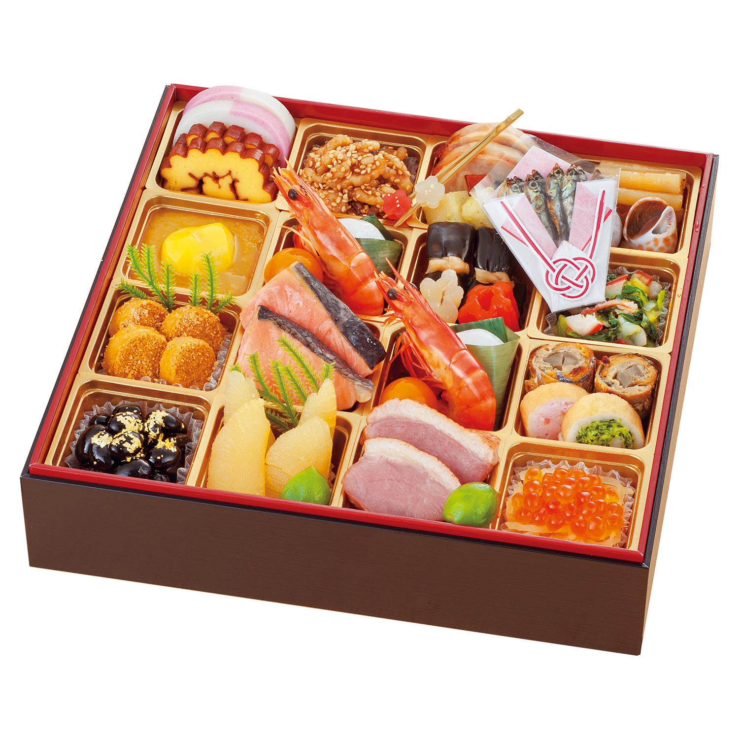 <内容>市松蒲鉾、伊達巻、栗きんとん、たらこ旨煮、黒豆金箔のせ、ごまくるみ、笹巻みたらし餅、金柑蜜煮、海老艶煮、鮭味噌焼、味付数の子、若鶏菜の花巻、筍木の芽味噌和え、昆布巻、花こんにゃく白、花こんにゃく赤、合鴨燻製、若桃甘露煮、叩き牛蒡、バイ貝旨煮、北寄貝と青菜の柚子胡椒和え、田作り、さんま八幡巻、なごみ巻(海老)、なごみ巻(ほうれん草)、紅白なます、いくら醤油漬、紅白梅松葉