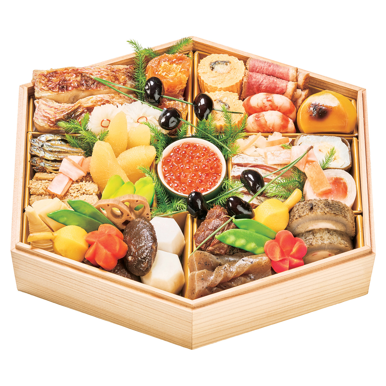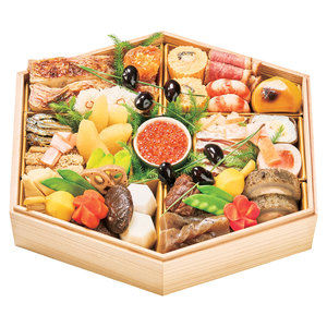 <内容>甘鯛味噌幽庵焼、市田柿、菊花蕪、鰻巻玉子、合鴨ロース、車海老旨煮、栗蜜煮、味付数の子、千社唐味噌漬、田作り、たたき牛蒡、味付いくら、鯛昆布〆焼霜、紅白なます、ひらめ求肥巻、サーモン絹巻、竹の子煮、どんこ椎茸旨煮、蓮根煮、海老芋煮、梅形人参旨煮、棒鱈煮、結び蒟蒻旨煮、堀川牛蒡海老真蒸射込み、くわい蜜煮、絹さや煮、結び紅白なます、黒豆松葉