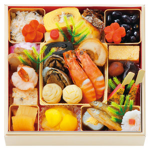 <内容>かになます、海老姿煮、お多福豆煮、鹿の子真如、合鴨ロース、菊花かぶら、栗きんとん、寿昆布巻、さわら西京焼、味付け数の子、ねじ梅人参、うなぎ真如、羽子板海老、ふくさ真子玉〆、福豆ぶどう煮、蝦夷鮑、う巻玉子焼、海老ぼたん揚、松笠くわい、もろこ南蛮漬、栗渋皮煮、竜飛巻、若鶏竜眼煮(酢味噌たれ(かになます用))