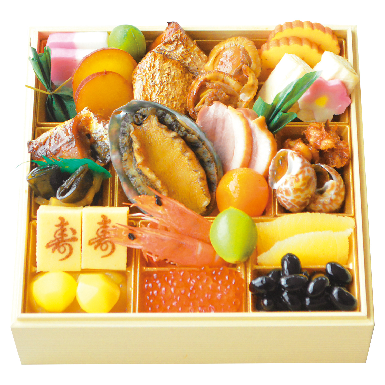 <内容>紅白市松かまぼこ、若桃甘露煮、丸十レモン煮、牛笹巻、ホタテ照焼、ぶり照焼、伊達巻、巻き湯葉、梅麩煮、棒だら、一口昆布巻、あわび柔らか煮、合鴨ロース、金柑甘露煮、かつおくるみ、梅貝旨煮、寿カステラ、芋きんとん、栗甘露煮、海老艶煮、いくら醤油漬け、紅白なます、味付数の子、れんこん柚子マリネ、黒豆煮