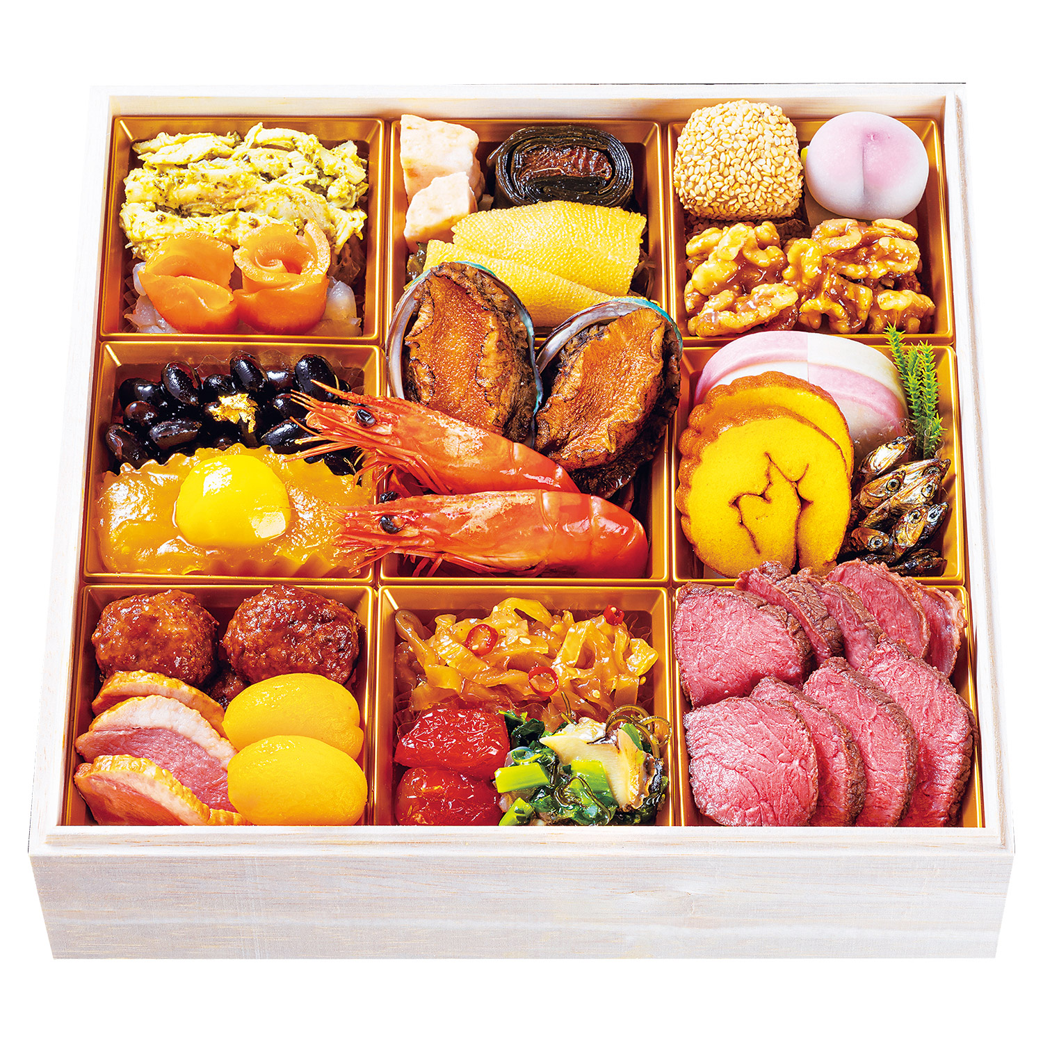 <内容>蒸し鶏ジェノベーゼ、スモークサーモントラウト、オニオンマリネ、ふんわりえびしんじょう、にしん昆布巻、味付数の子、中華わかめ、ごま団子、花餅もも、くるみ甘露煮、黒豆煮 金箔飾り、栗甘露煮、きんとん、鮑煮、松前漬、海老の旨煮、紅白蒲鉾、伊達巻、田作り煮、肉団子黒酢風味、合鴨燻製、杏子煮、中華くらげ、ドライトマト赤ワイン風味、赤にし貝と菜の花昆布和え、十勝ハーブ牛ローストビーフ、サラダソース