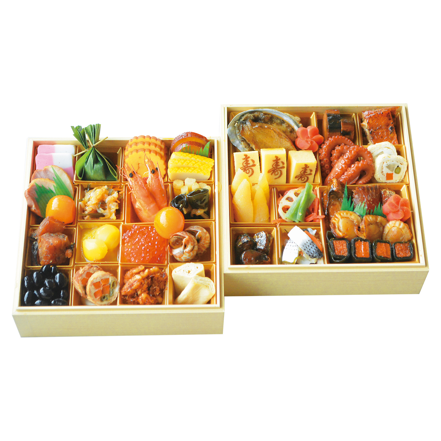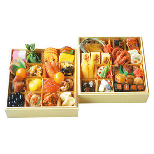 <壱の重>紅白市松かまばこ、牛笹巻、伊達巻、丸十レモン煮、いか黄金焼、合鴨ロース、金柑甘露煮、帆刺黄金松前、海老艶煮、たたき牛蒡、一口昆布巻、棒だら、栗甘露煮、芋きんとん、いくら醤油漬け、紅白なます、梅貝旨煮、黒豆煮、豚肉二色巻、かつおくるみ、巻き湯葉<弐の重>茶巾煮、あわび柔らか煮、梅人参煮、寿カステラ、かつお薫柔らか煮、赤魚西京焼き、たこ旨煮、信田三色巻、味付数の子、れんこん柚子マリネ、ぶり照焼、さんま八丁味噌漬け、こはだかぶら漬け、ホタテ照焼、小袖昆布巻き