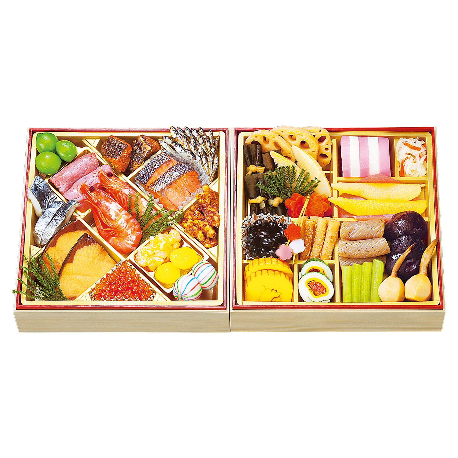 <1段目>若桃の甘露煮、鱈の旨煮、田作り、ローストビーフ(ソース付き)、鮭西京焼、酢さごし、海老姿煮、かつおくるみ、鰤照焼、小海老の魚卵和え、栗の甘露煮、きんとん、いくら醤油漬、てまり餅<2段目>れんこん焚、昆布巻、筍焚、金時人参焚、紅かまぼこ、白かまぼこ、紅白生酢、数の子、丹波黒豆、松葉梅ゼリー、胡麻和えたたき牛蒡、伊達巻、青菜巻、綱糸こんにゃく焚、しいたけ焚、ふき焚、芽付くわい六角焚