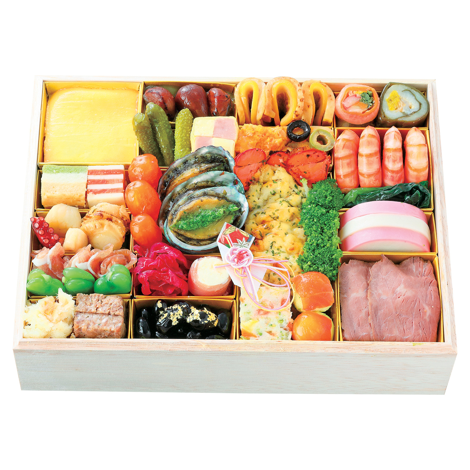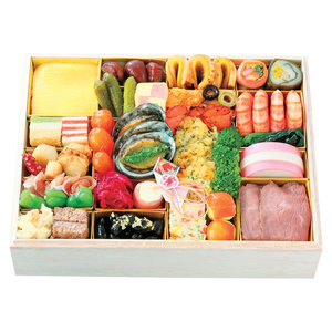 チーズケーキ、若松熨斗鶏、紅白紅鮭博多、海の幸のカプリサラダ、生ハム、空豆グラッセ、真鱈のブランダード、パテ・ド・カンパーニュ、栗金団、小きゅうりのピクルス、ハムとチーズ市松巻、味付鮑~ジェノベーゼソース~、ドライトマト赤ワイン煮、紫キャベツのピクルス、生ハムチーズ巻、黒豆甘露煮(金箔)、合鴨ロース焼き~オレンジソース~、ミックスビーンズ、チキンプロヴァンサル、オマールテルミドール焼、ブロッコリーのコンソメ煮、サーモンの彩りテリーヌ、若草手毬サーモン、五色砧巻き、真鯛龍皮巻、海老艶煮、菜の花煮びたし、紅白蒲鉾、ローストビーフスライス