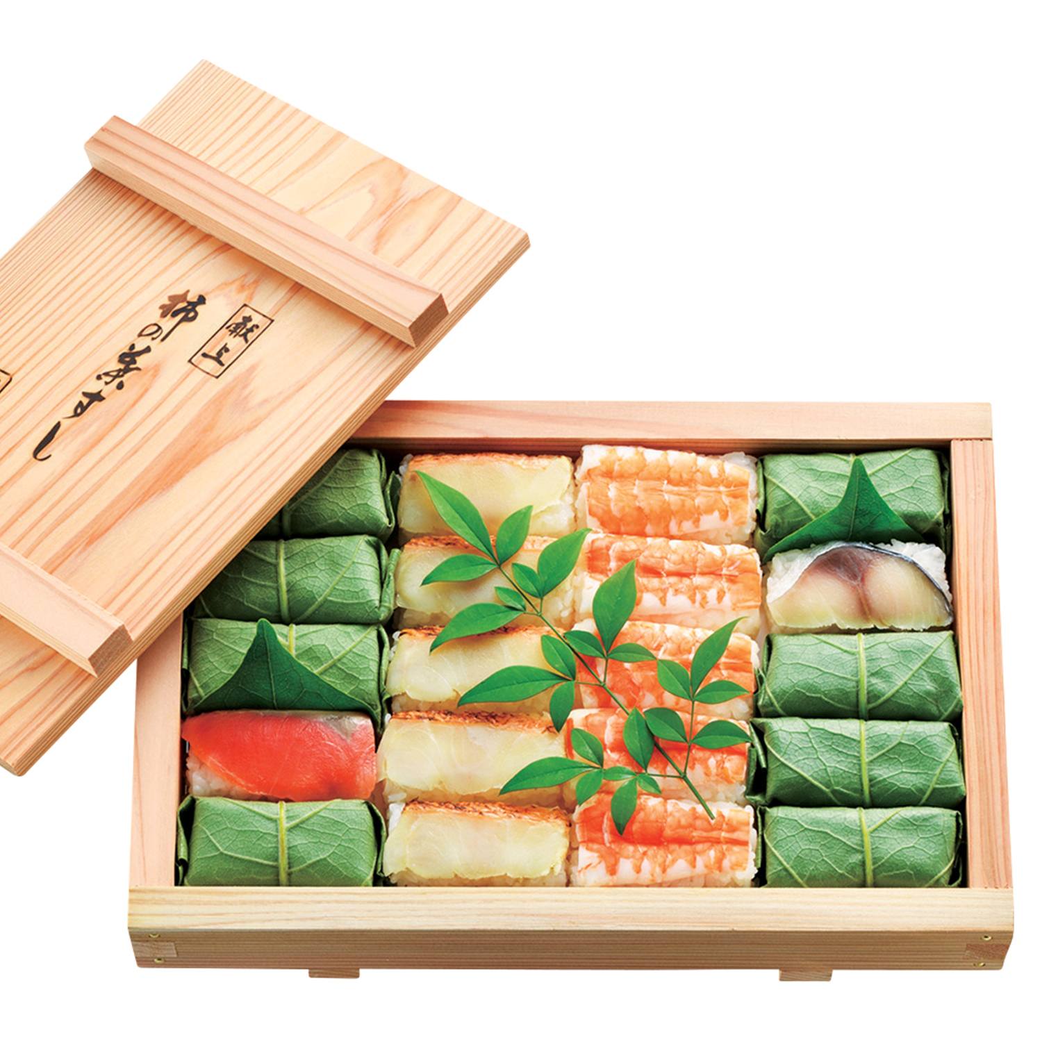 古くから奈良・五條地方で「お祝いのごちそう」として親しまれてきた「柿の葉すし」をお楽しみください。<内容>柿の葉すし(さば)、柿の葉すし(鮭)、迎春(炙り金目鯛)、迎春(えび)