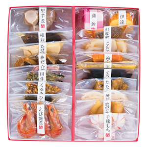 金沢きっての老舗料理旅館の美味。伝統が磨き上げた加賀料理の粋をお届けします。<内容>蒲鉾、伊達巻、鮭味噌漬焼、こんにゃく煮、梅人参煮、栗きんとん、くろまめ蜜煮、たたき牛蒡、酢蓮根、数の子醤油漬、手毬もち、里芋煮、椎茸煮、たけのこ煮、棒だら煮、合鴨ロース燻製、田作り、くるみ佃煮、ひとくち昆布巻、えび艶煮