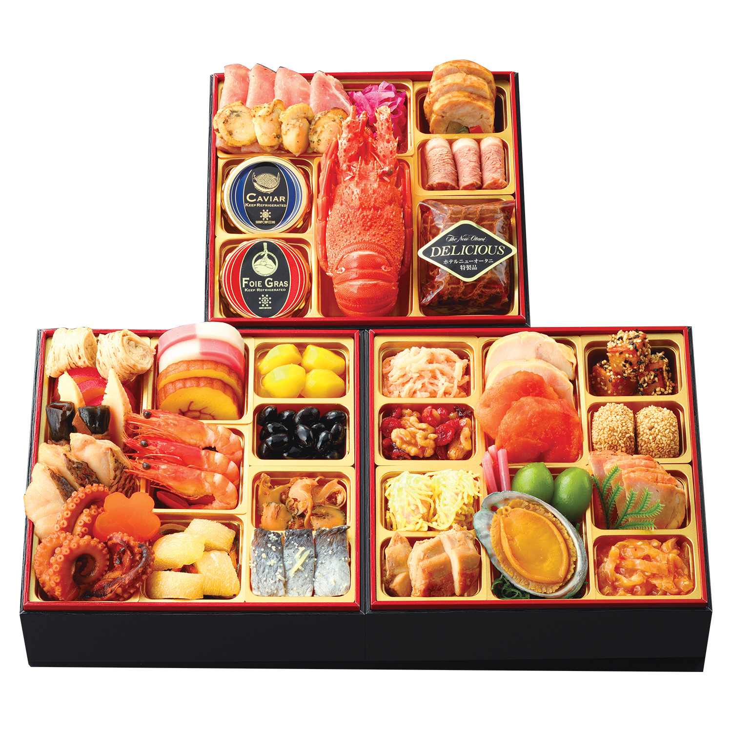 真鯛幽庵焼、蛸の照焼、伊達巻き、紅白蒲鉾、焼湯葉、黒豆煮、松前漬、北海道産数の子、金団餡、栗甘露煮、紅白なます、にしん一口巻、有頭海老、若布煮、鳴門金時芋レモン煮、味付け梅型こんにゃく、にしん黄金、つぶ貝しぐれ煮、味付け焼筍