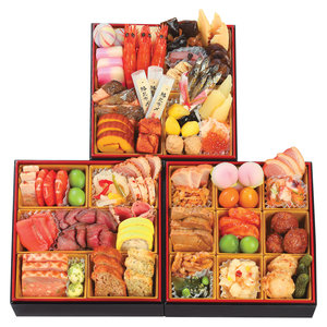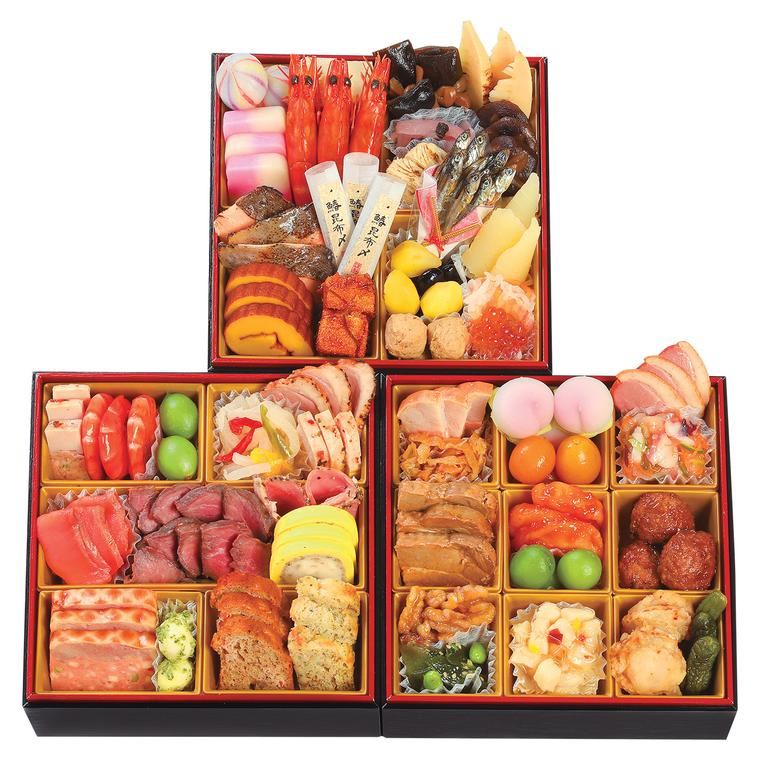 手まりもち、市松蒲鉾、鶏高野サンド、海老艶煮、サーモン西京焼、伊達巻、鰆昆布〆金箔紙包み、真だら子の旨煮、にしん昆布巻、椎茸の旨煮、淡路玉ねぎの梅しそ漬け、味付焼春たけのこ、焼き湯葉巻、但馬鶏と蓮根のつみれ、田作り、丹波黒豆、栗甘露煮、紅白なます、いくら醤油漬け、味付 数の子