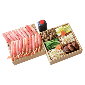 ●かに脚20本、ぶなしめじ、白菜、青梗菜、えのき、椎茸、うどん、飾り人参、ポン酢180ml/2~3人前