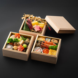 ◎ネット限定品<1段目>笹巻麩(抹茶)、抹茶入り伊達巻、数の子、たたき牛蒡、酢取茗荷、梅麩煮、花蓮根 甘酢漬け、助子生姜煮、黒豆<2段目>いくら、紅白なます、袱紗玉子、車海老 艶煮、田作り、絹さや、平目 竜皮巻、子持ち鮎 甘露煮、サーモン錦糸巻、蛸 柔らか煮<3段目>あわび旨煮、裏白椎茸、六方小芋、鰊 昆布巻、六方慈姑、梅貝 酒煮、筍 土佐煮、湯葉揚げ煮、千社塔、梅人参 梅煮、菜種サーモン巻、日の出牛蒡