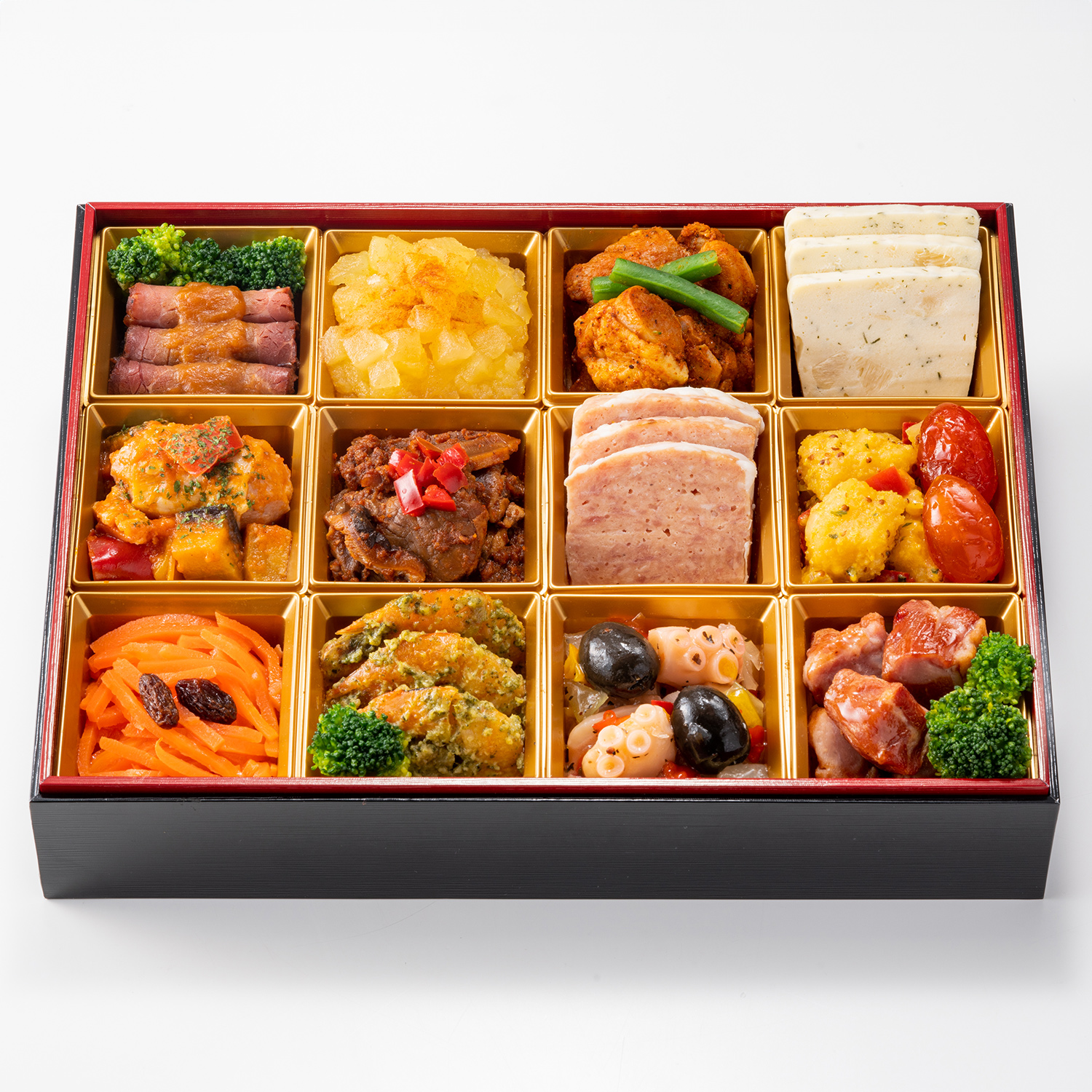 ◎ネット限定品<内容>ローストビーフ グレービーソース添え、ブロッコリーコンソメ風味、りんごきんとん シナモン風味、スパイスグリルチキン インゲン添え、ホタテのテリーヌ、ミートローフのラタトゥイユソース添え、椎茸入りビーフシチュー、テリーヌドカンパーニュ、カジキのハニーマスタードソース、ドライトマト赤ワイン煮、キャロットラぺ、エビのバジルマヨソース、たこのマリネ バジル風味、オリーブのマリネ、鴨のスモーク