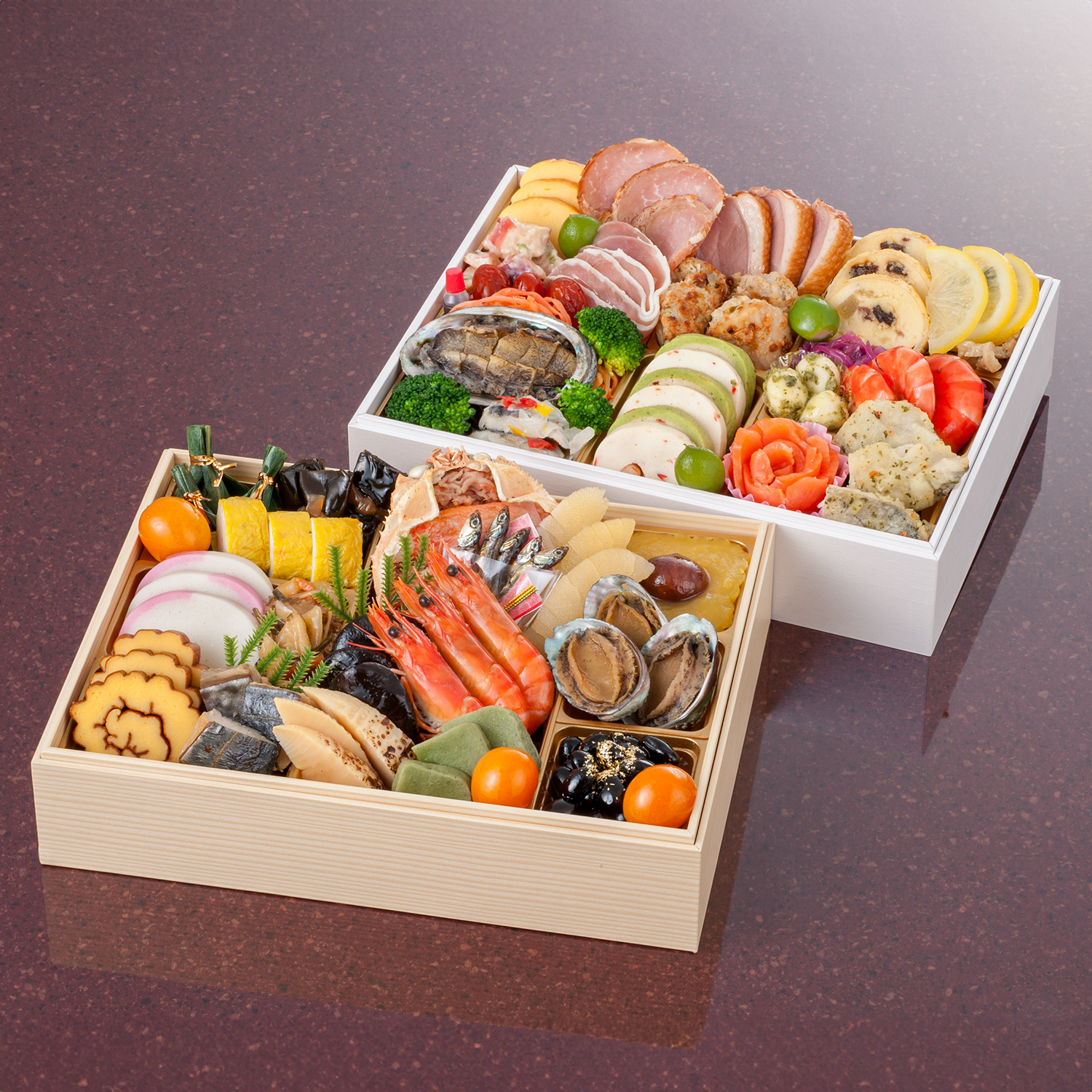 牛肉しぐれ笹包み、にしん昆布巻、小町ゆば、市松蒲鉾、松前漬、伊達巻、鰆柚庵焼、甲羅盛り(かに味噌和え)、味付数の子、田作り、椎茸煮、海老艶煮、焼筍煮、味付よもぎ麩、渋皮栗きんとん、あわび煮、黒豆金箔のせ、金柑蜜煮