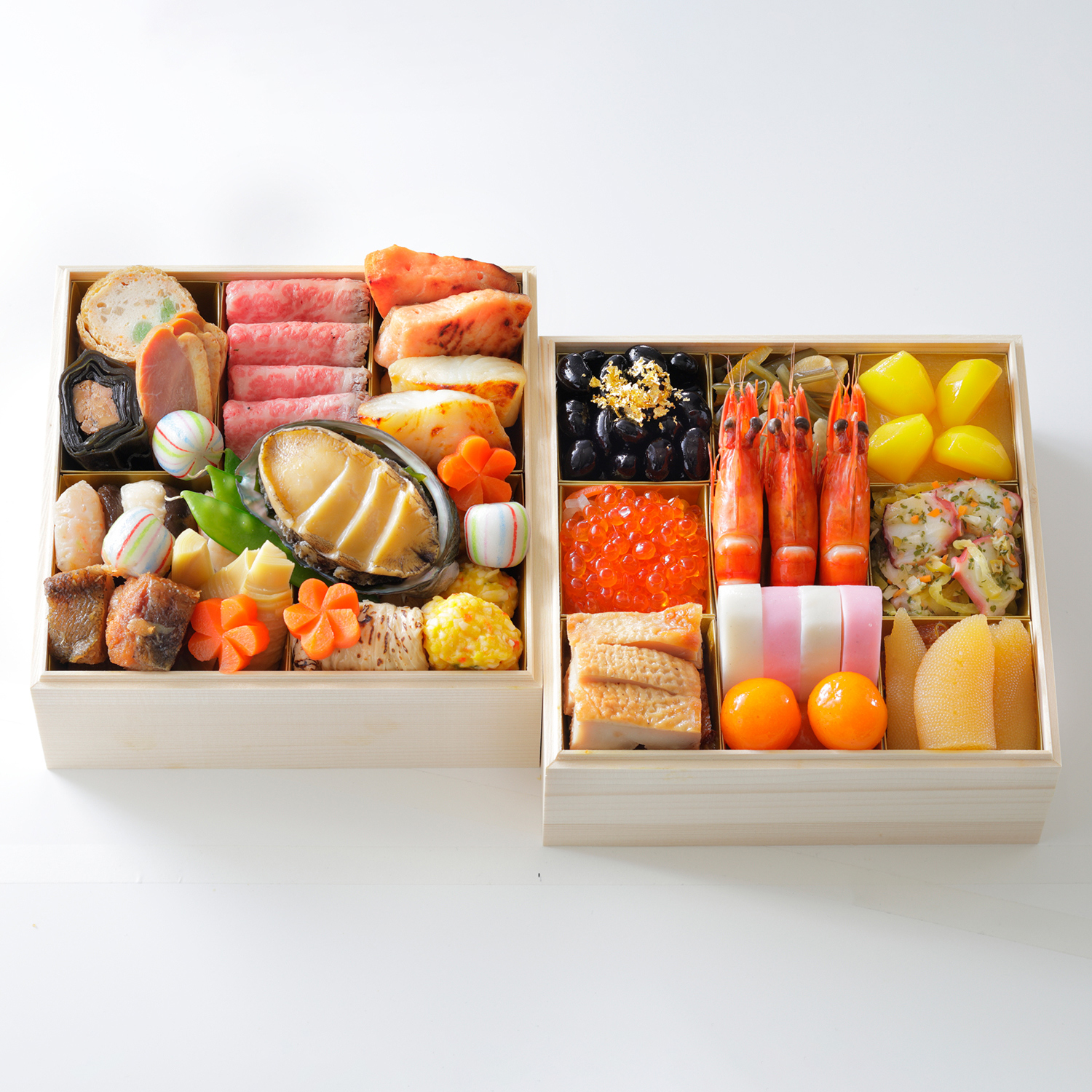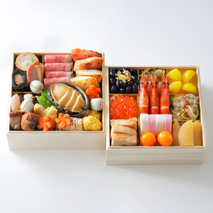 ◎ネット限定品<壱の重>ぶどう豆蜜煮(金箔添え)、茎わかめ 酢の物、栗甘露煮、栗きんとん オレンジ風味、いくら醤油漬、紅白なます、海老つや煮、蛸とセロリの和風カルパッチョ、鶏酒盗焼き、紅白かまぼこ、金柑蜜煮、味付数の子、するめ松前漬<弐の重>信田巻、鮭昆布巻、合鴨オレンジ煮、手毬餅、黒毛和牛ローストビーフ、キングサーモン西京焼、銀だら西京焼、海老陣笠、鱈煮、筍煮、絹さや煮、梅人参煮、鮑やわらか煮、焼き湯葉巻、蟹味団子