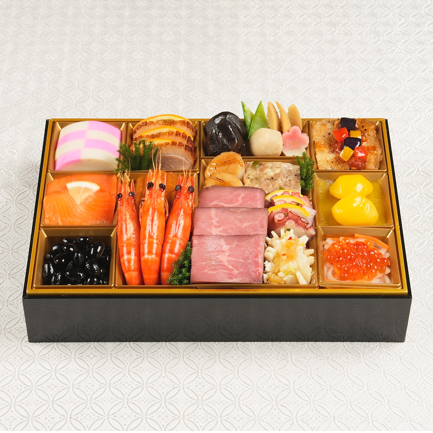 ●内容:市松蒲鉾、サーモントラウト、春雨和え、黒豆、合鴨スモーク、オレンジ、伊達巻き、有頭海老、椎茸煮、小芋旨煮、筍煮、絹さや、梅麩、帆立のバター醤油ソテー、ピスタチオ入りパテ、ローストビーフ、グリルオニオンと皮付きポテト、釜揚げたこのマリネ、くらげとイカのねぎ生姜和え、グリルチキンのトマトソース、栗きんとん、いくら、紅白なます
