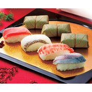 紅白なます、味付いくら、黒豆煮、梅型生麩、紫芋きんとん、栗甘露煮、笹団子、椎茸煮、味付け数の子、紅白かまぼこ、お祝い海老煮、ブリの照焼