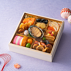 ●内容:つぶ貝わさび漬、スモークサーモントラウト柚子胡椒添え、黒豆、五郎島金時きんとん、五郎島金時芋スライス、白海老甘酢漬、味付けいくら、紅白なます、のどぐろ南蛮漬、てまり餅、牛肉とごぼうのしぐれ煮、松前漬、煮あわび、角煮、紅白蒲鉾、伊達巻、金柑蜜漬、若桃蜜漬、ぶり照焼、合鴨燻製、牛肉八幡巻