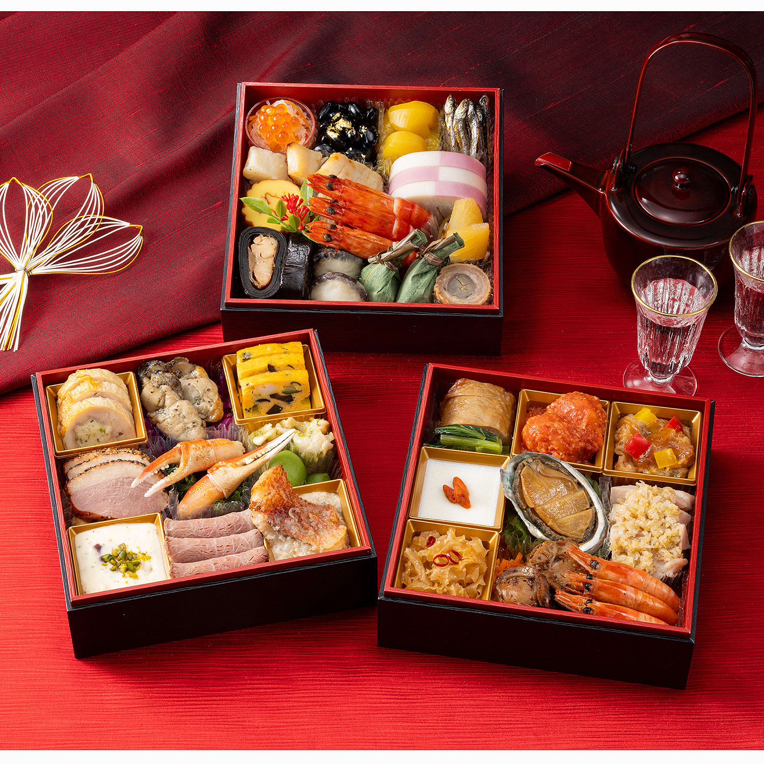 紅白なます いくら添え、金箔黒豆、きんとんと甘露栗、田作り、カラスガレイ西京焼、市松かまぼこ、伊達巻、たたきごぼう、浜汐海老、数の子美味漬、葉わさび松前漬、鰊昆布巻、裏白しいたけ、笹しぐれ、豚八幡巻