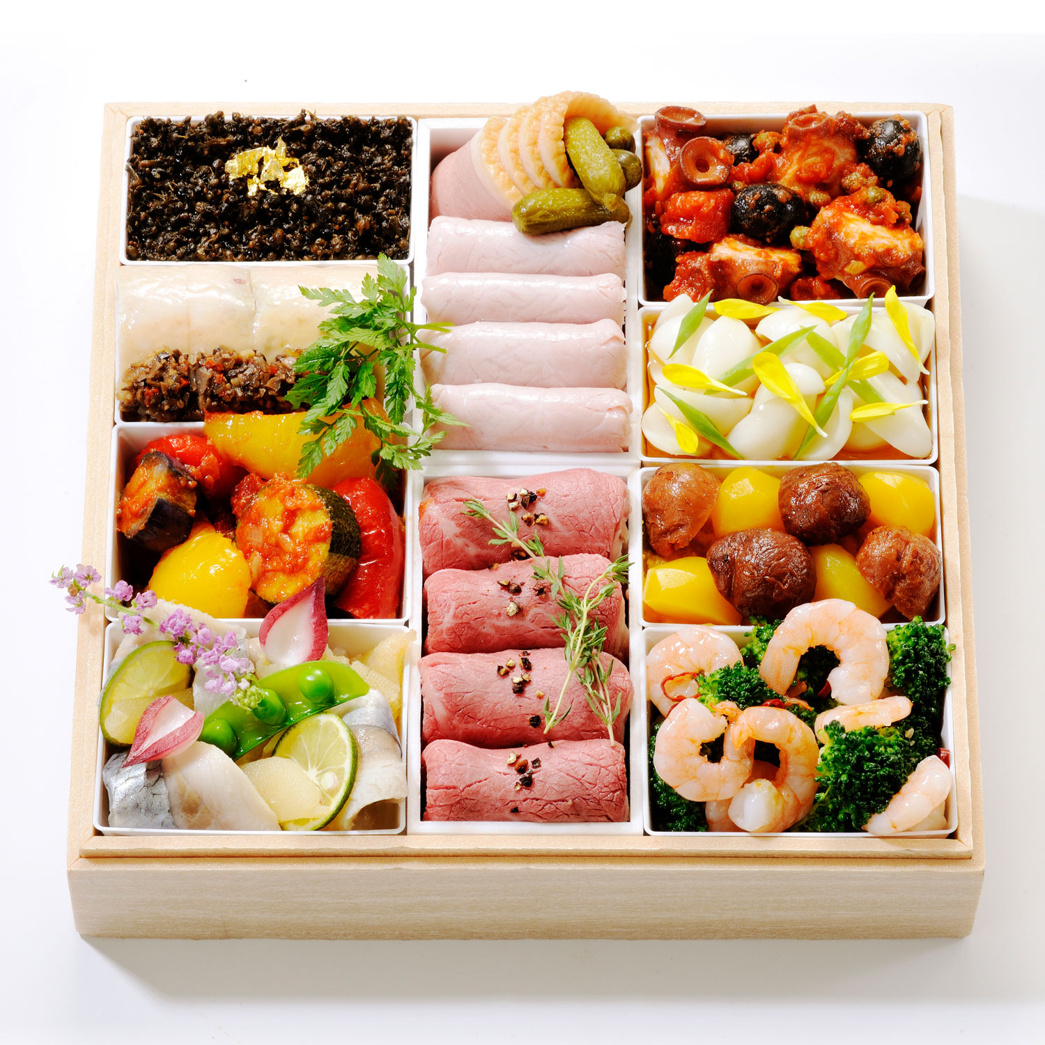 若鶏のガランティーヌ、真蛸のトマト煮、洋風栗きんとん、海老とブロッコリーのペペロンチーノ、合鴨スモークとボイルハム、ローストビーフ、ラタトゥイユ、カニのムースと百合根の酢ゼリー、にしんと数の子のマリネ、黒豆ゼリー