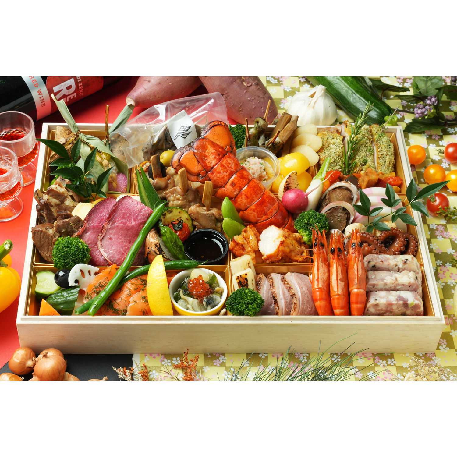 合鴨ロースの赤ワイン煮、和風スペアリブ、燻製砂肝のコンフィ、帆立の燻製、オリーブ、ローストビーフ 西洋わさびソース、道産鶏もも肉の香草パン粉焼き、野菜のトマト煮込みカポナータ、トラウトサーモンのマリネ ディルソース、オマール海老のアメリケーヌソースオーブン焼き、道産ツブ貝のわさびマリネ イクラ添え、数の子、紅白市松、鶏肉の竹の葉ちまき、天然殻付き鮑の旨煮、タコの磯焼き、海老の香草オイルマリネ、彩り野菜ピクルス、ポークテリーヌ、ズワイガニのロワイヤル柚木風味、豊年餅、甘栗、炭火焼もも串、アカニシの香草松葉、たたきごぼう、焼き筍、うなぎの笹めし、ブロッコリー、里芋、長ネギ、オクラ、いんげん、ズッキーニ、じゃがいも、カリフラワー、スナップエンドウ、ラディッシュ、玉ねぎ、かぶ、レモン