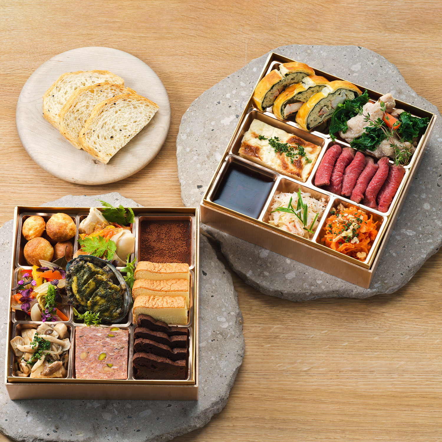 美瑛ファームのコンテチーズをふりかけたグージェール、カラフル野菜のスパイスピクルス、数種類のキノコ シェリービネガーのマリネ、長万部町湾宝帆立のバスケーズ煮込み、函館産活鮑のコンフィ 肝とジェノベーゼソース、洞爺湖町鹿肉のテリーヌ ねずの実とハスカップ風味、北海道産マスカルポーネ使用 アルケミストコーヒーを使ったティラミス、台湾カステラ 北海道産菩提樹の香り、いちじくと赤ワインを使ったパウンドケーキ