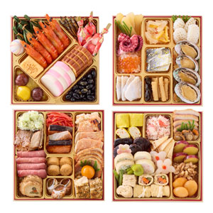 ばい貝旨煮、てまり餅、田作り、友禅紅白串、海老艶煮、寿玉子、伊達巻、紅白かまぼこ、栗きんとん、黒豆金箔