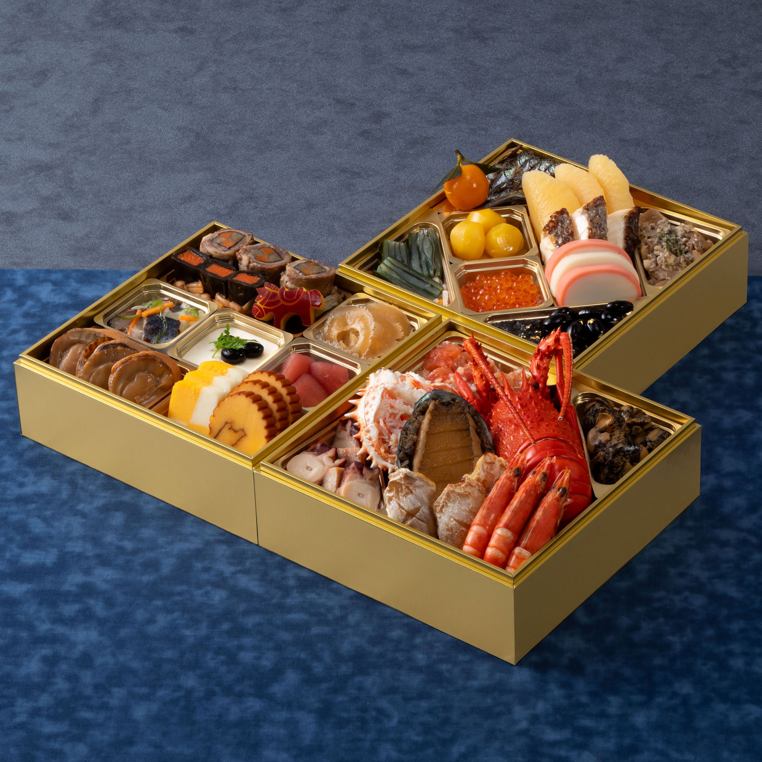 つぶ生姜煮、秋鮭糀漬け、たこ柔らか煮、伊勢海老、タラバガニ甲羅詰め、大ぶりあわびふくら煮、焼き車海老、れんこ鯛両妻焼き