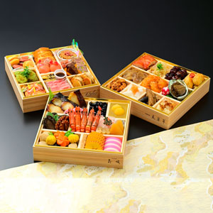 蓮根紫蘇酢漬け、銀鱈自家製西京焼き、黒豆艶煮 千代呂木、自家製練り金団、鰊の昆布巻き、蝦夷鮑山椒煮、子蛸の旨煮、海老の芝煮、紅白柚子なます、五色小肌巻き、叩き牛蒡利休和え、数の子亀甲漬け、野菜の旨煮七種盛り、若鶏味噌松風焼き、伊達巻、紅白蒲鉾
