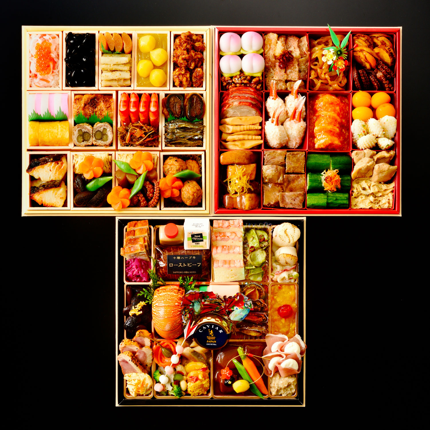 黒豆蜜煮、紅白小袖蒲鉾、伊達巻玉子、鰹胡桃、栗金団、紅白膾、いくら、叩き酢牛蒡、数の子、松前漬け、海老旨煮、銀鱈西京焼、牛肉八幡巻、鶏照り焼、田作り、鰊昆布巻、飛竜頭、焼湯葉旨煮、椎茸艶煮、蛸足照り焼、ねじり蒟蒻、捩り梅人参、ささげ
